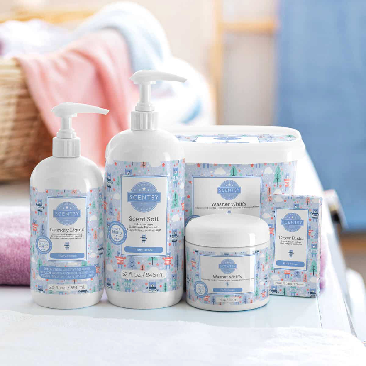 Fluffy Fleece Laundry Liquid, Scent Soft, Washer Whiffs, and Dryer Disks packaging